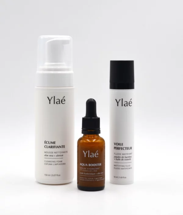 Le Trio Purifiant réunit la mousse nettoyante Écume clarifiante, le sérum hydratant Aqua booster et le fluide matifiant Voile perfecteur pour une routine visage complète, idéale pour les peaux mixtes à grasses.